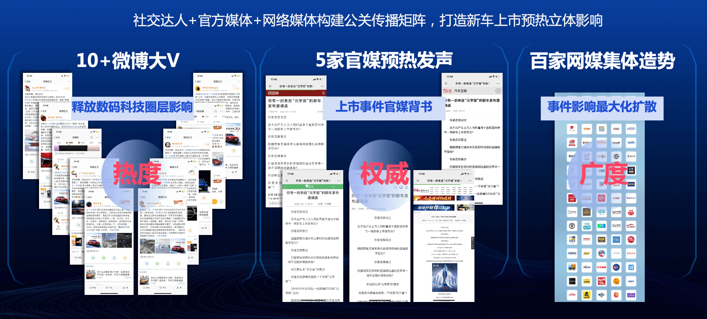 上市发布会前,一汽奔腾联动10余个数码科技类大V围绕话题进行预热造势,辐射数码科技跨界圈层人群;联动百余家网媒共同预热发声;同时借助包含环球网、中国青年网、中青在线、中国网、国际在线等5家官方媒体持续对外扩散奔腾B70S发布会预热信息,从热度、广度、权威度三个层面着手,释放全媒体资源矩阵影响力。