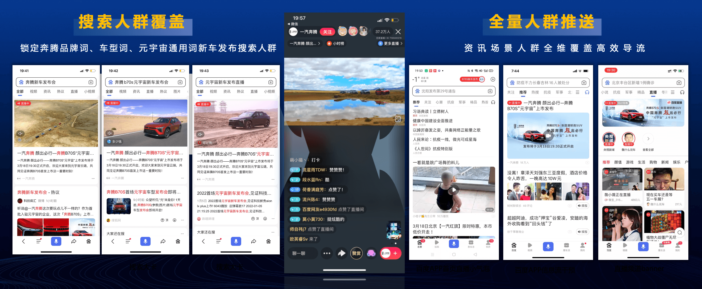 在百度搜+推生态资源层面,通过搜索大卡锁定有一汽奔腾品牌词、车型词及元宇宙通用词新车发布相关搜索行为人群,在资讯场景中借助信息流干预、直播气泡、频道banner等资源位进行发布会直播信息推送,同时,在百度开屏资源的运用中,以通投和精准定向两种手段,确保资源曝光范围及核心人群的精准覆盖。其中通投资源根据发布会不同时段匹配不同创意表达;另外,在发布会重点时段,通过开屏Always的方式聚焦近三天搜索奔腾、奔腾B70S及对应竞品词的搜索人群进行重点曝光。