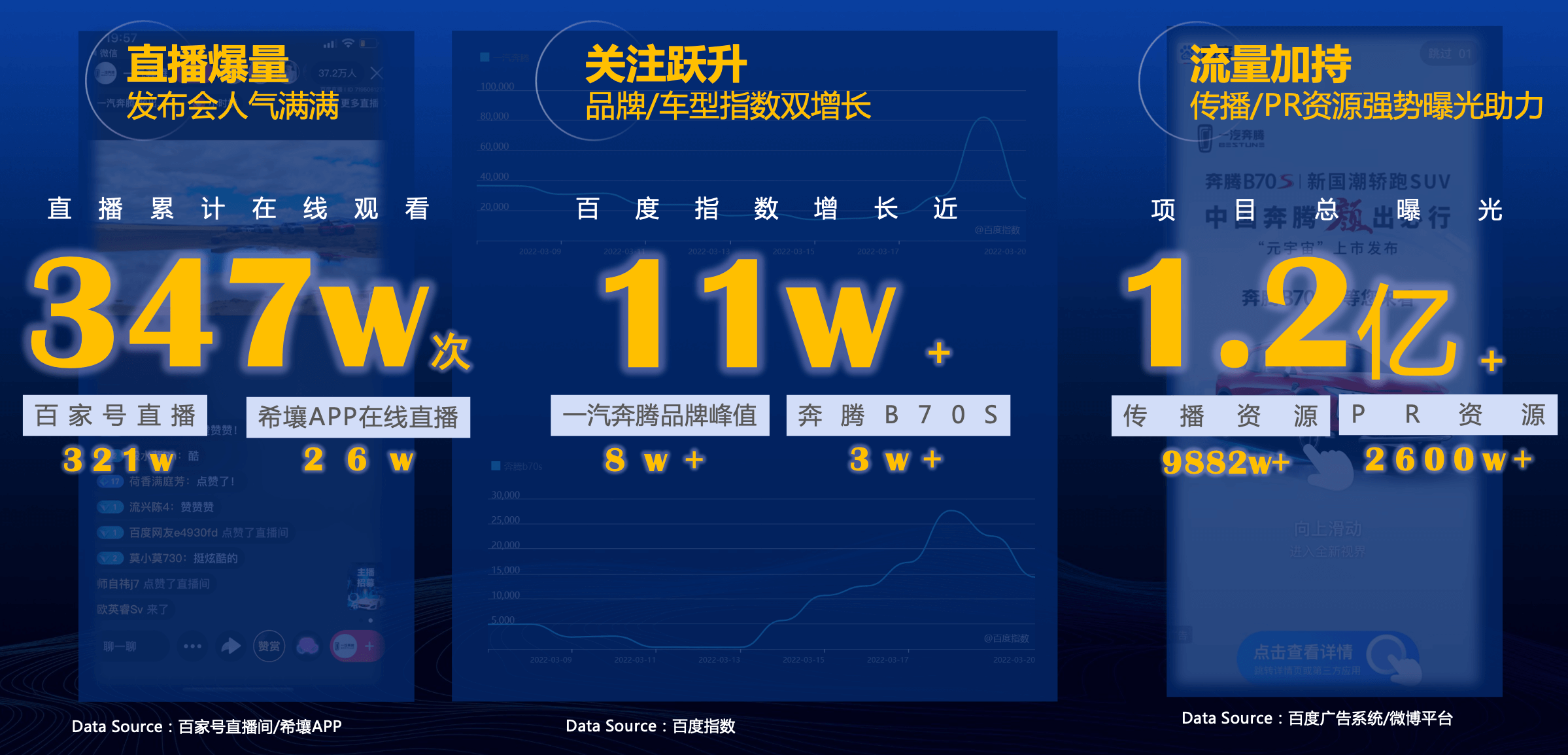 此次发布会,是一汽奔腾持续建立和加深品牌年轻化标签,深化年轻圈层认知,链接“新升代”族群的创新尝试。作为首个在希壤元宇宙平台打造新车发布会的汽车品牌,一汽奔腾正式解锁了新车发布的全新营销场景。整场元宇宙发布会,一共获得了直播观看量347万人次、品牌及新车百度指数增长近11万,总曝光量1.2亿的好成绩。