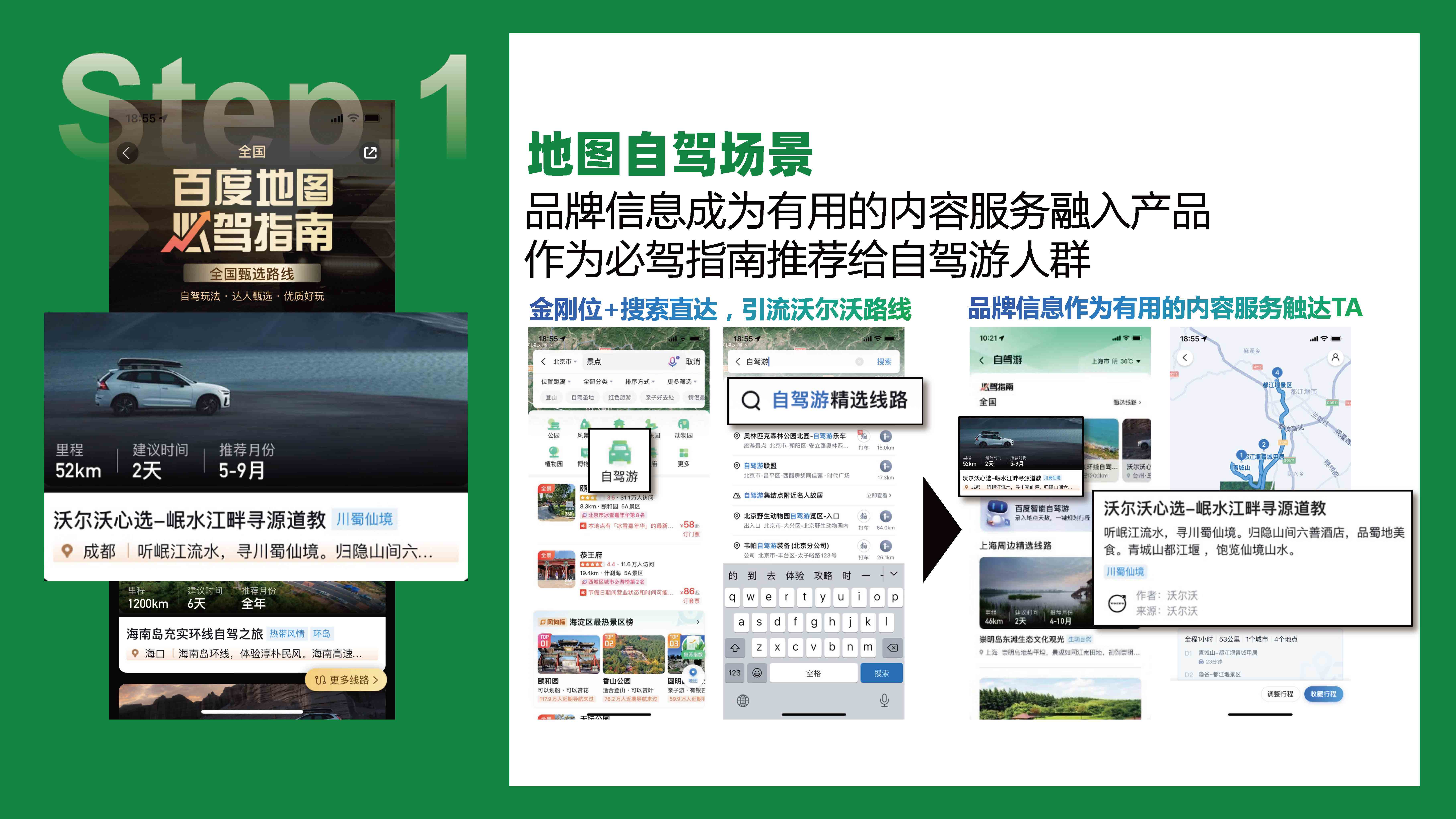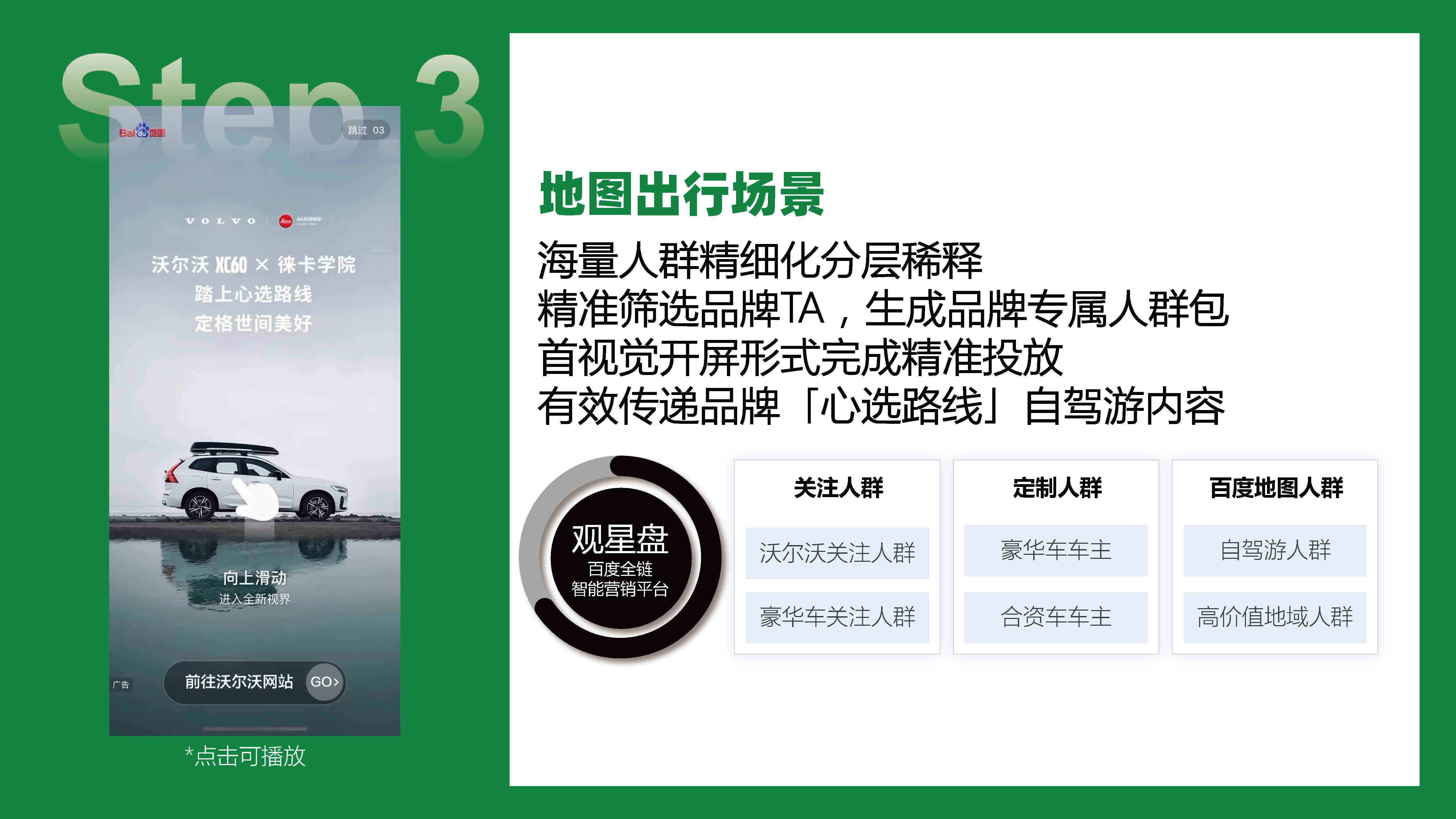 品牌信息成为有用的内容服务融入产品,作为必驾指南推荐给自驾游人群。精准锁定地图自驾场景为沃尔沃量身定制的「百度地图必驾指南」。