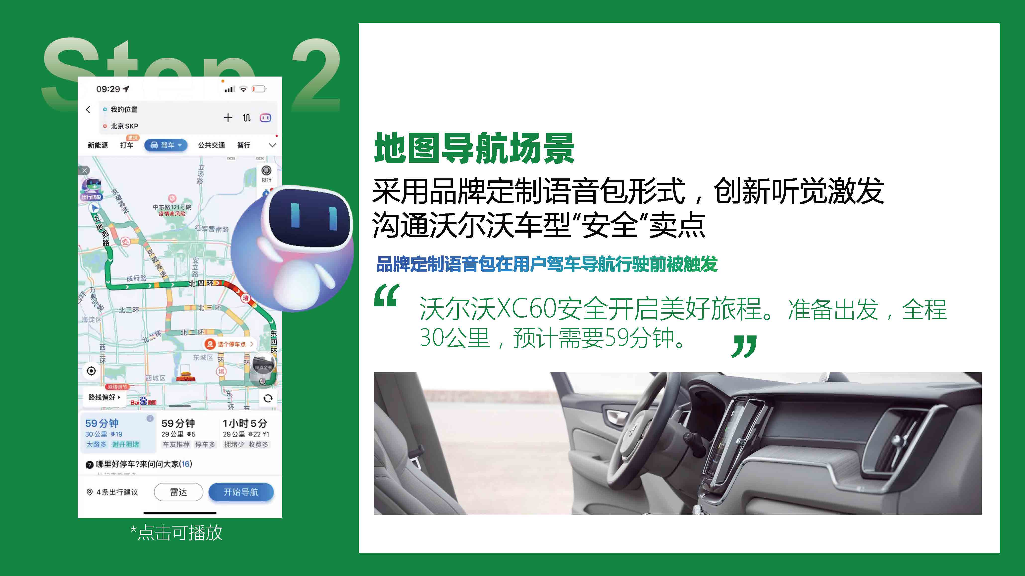 在车主导航常用场景,采用品牌定制语音包形式,创新听觉再次激发用户对沃尔沃品牌认知,植入车型安全卖点。