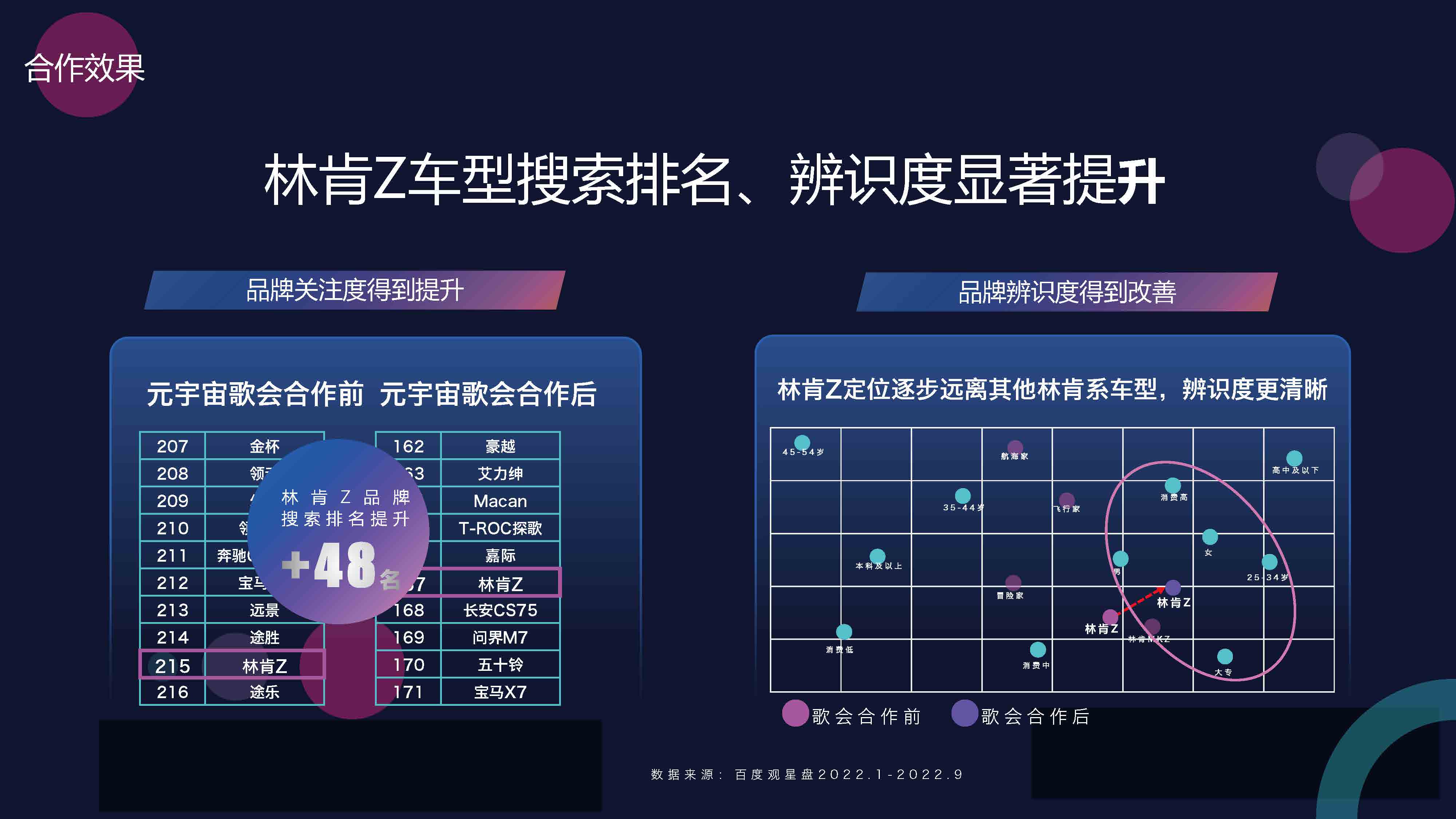 林肯Z登陆百度热度TOP10,年轻人群TGI提升198%,品牌数字人定制视频播放量近9000万,林肯Z品牌搜索排名提升48名。
